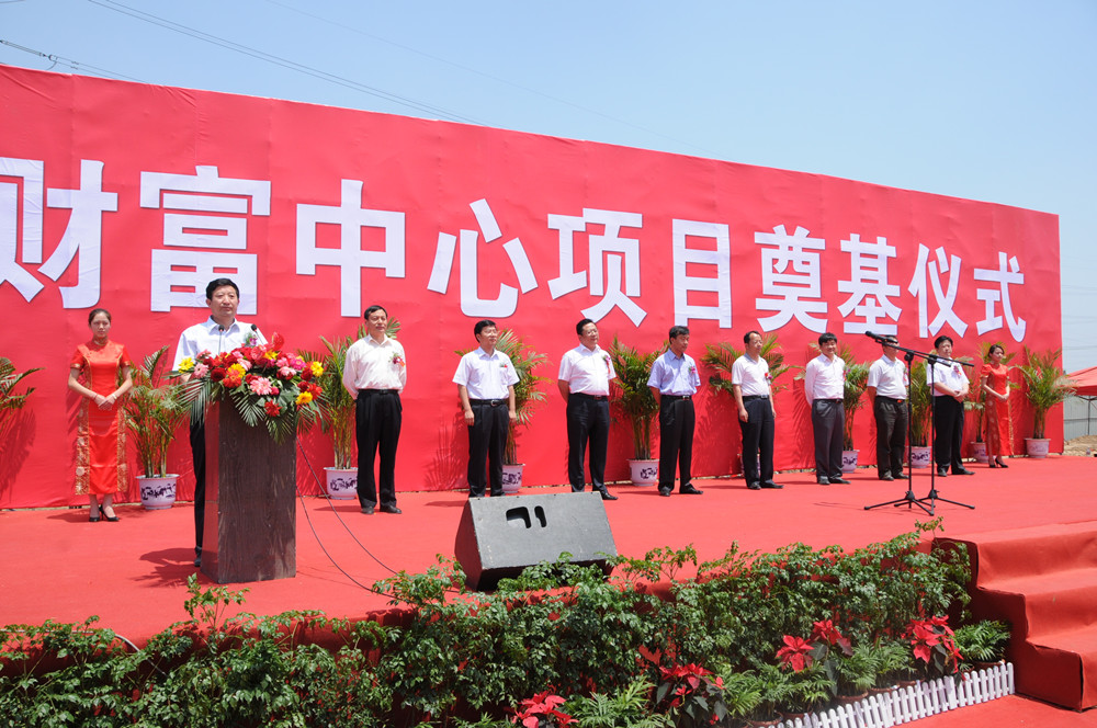 5月28日,財富中心項目舉行奠基儀式。在主席臺的領導及嘉賓有:高新區黨工委委員、管委會副主任譚建民,高新區建設局黨委書記、局長鐘光文,高新區新城街辦黨委書記杜月新,濰坊金正房地產開發有限公司董事長張汝建,聯合潤通水務有限公司副總經理胡義,濰坊金正房地產開發有限公司總經理匡衛東。