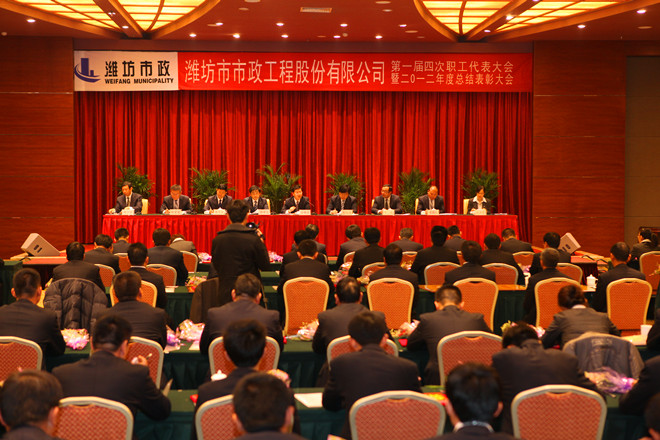 2013年3月16日上午,集團市政公司第一屆四次職工代表大會暨二〇一二年度總結表彰大會在新富佳悅大酒店會議中心一號會議室舉行。集團公司黨委書記、董事長、市政公司董事長徐鵬強,集團公司黨委副書記、總經理朱九洲,集團公司黨委副書記、監事會主席、紀委書記滕忠斌出席大會。市政公司高管層領導、一屆職工代表及2012年度受到表彰的先進集體代表和先進個人共計125人參加了會議。