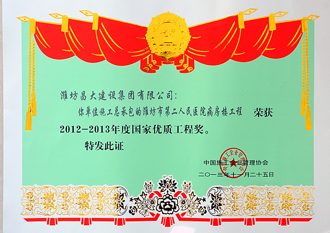 2013年12月27日,中國(guó)施工企業(yè)管理協(xié)會(huì)在北京召開(kāi)“2012-2013年度國(guó)家優(yōu)質(zhì)工程獎(jiǎng)”表彰大會(huì),為獲獎(jiǎng)?wù)哳C獎(jiǎng)。由集團(tuán)第一分公司施工的濰坊市第二人民醫(yī)院病房樓工程獲此殊榮。