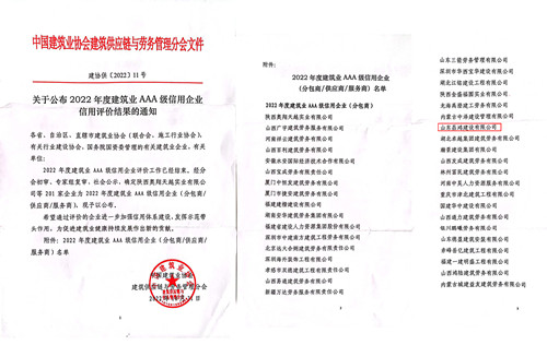 近日,中國建筑業(yè)協(xié)會建筑供應鏈與勞務管理分會公布了2022年度建筑業(yè)誠信勞務企業(yè)評價結果,山東昌鴻建設有限公司被評為建筑業(yè)AAA級信用企業(yè)(分包商/供應商/服務商)。自2019年至今已連續(xù)四年獲得全國3A級建筑誠信勞務企業(yè)殊榮。