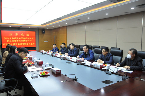 2023年1月10日上午,濰坊水務投資集團黨委副書記、副總經理申來鳳一行4人來集團公司訪問,集團總裁朱九洲陪同。賓主雙方就項目合作、國企混改等方面進行座談交流。 集團副總裁劉雁冰出席相關活動。 集團公司企業發展部總經理張煒、財務部總經理張福濤、法務部總經理高勇、三建公司總經理相有鵬參加相關活動。