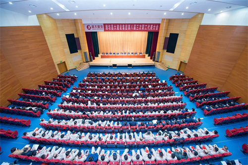 文化宮穹頂璀璨,碧華應時。“團結凝聚力量、奮斗創造奇跡,挺膺擔當、不負時代、不負華年,全面推進企業高質量發展!”的大幅標語催人奮發。上午九時,會議如期開幕。集團董事長徐鵬強、總裁朱九洲以及穆乃杰、姜建魯、房海、吳杰、劉雁冰、楊成國、惠守江、孟憲禮、王建波等高管出席大會并在主席臺就座。集團第八屆職工代表、列席代表,集團中層管理人員、2022年度受表彰的先進集體代表和先進個人以及總部全體人員共337人參加大會。