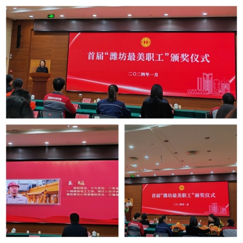 2024年1月19日上午,由市總工會舉辦的首屆“濰坊最美職工”頒獎儀式在濰坊市工人文化宮一樓西區104會議室隆重舉行。集團公司工會主席穆乃出席頒獎儀式。在首屆10名最美職工中,集團機施公司維修電工王超獲此殊榮。