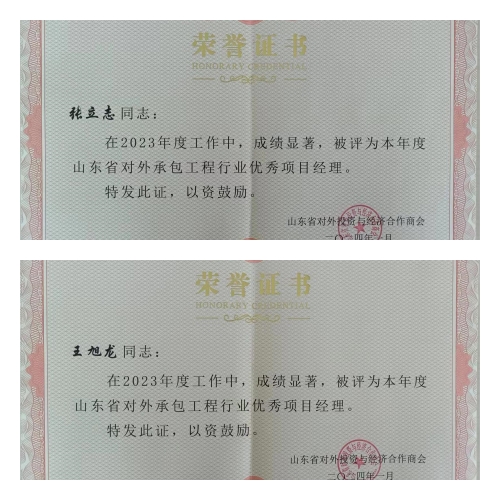 2024年3月12-13日,山東省對外投資與經(jīng)濟(jì)合作商會舉行行業(yè)發(fā)展交流大會,并對2023年度商會先進(jìn)單位和個人進(jìn)行表彰,集團(tuán)獲“二〇二三年度山東省對外承包工程行業(yè)先進(jìn)單位”榮譽(yù)稱號,海外公司張立志、王旭龍獲“山東省對外承包工程行業(yè)優(yōu)秀項(xiàng)目經(jīng)理”榮譽(yù)稱號。